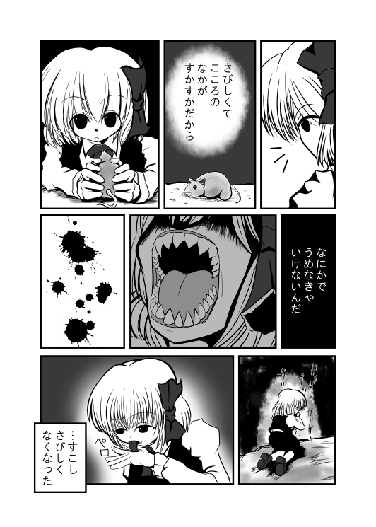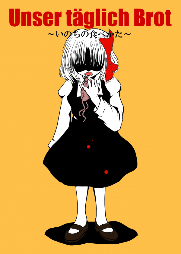 無事入稿しました。…ま、「無事」と云うまでに紆余曲折あったんですが、そこら辺のすったもんだはあとがきにダラダラ書いてます。 取り敢えずサンプル紹介 新刊『Unser täglich Brot ~いのちの食べかた~』 12p ¥100 第四回東方崇敬祭 "キ10" ブースにて販売しております。 ルーミアメイン本。表紙画像に色付いてますけど、実際は1色です。…ギャグ無しとかってかなり冒険だよね、俺の場合。 さ、告知も終わったし、早速原稿描いてる間、開封せずに我慢してたゲームとDVD開けるとすっか。